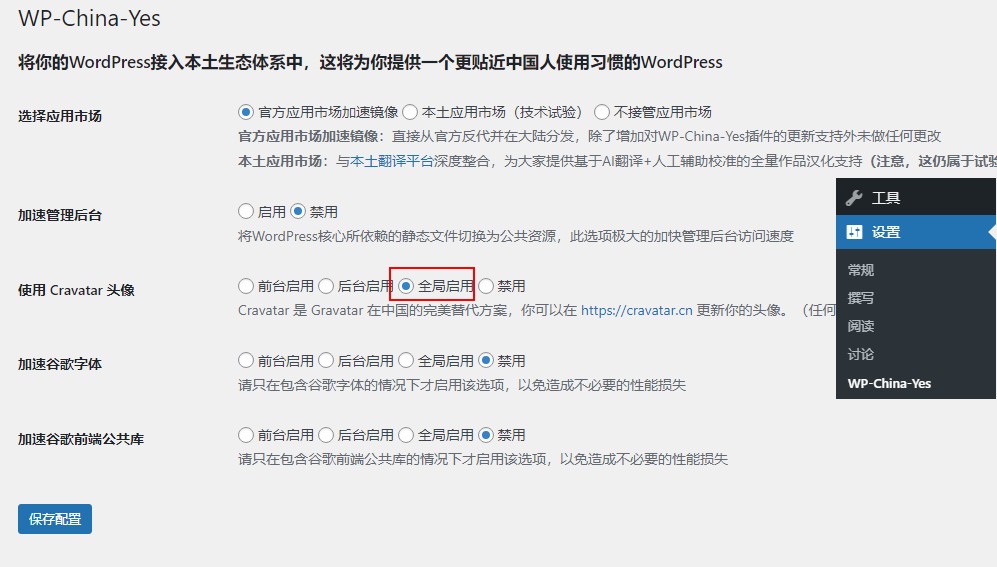 Cravatar的使用有多种方式,咱们介绍使用WP-China-Yes 插件。可以网络寻找资源自行下载,之后上传到WordPress进行插件安装和使用。