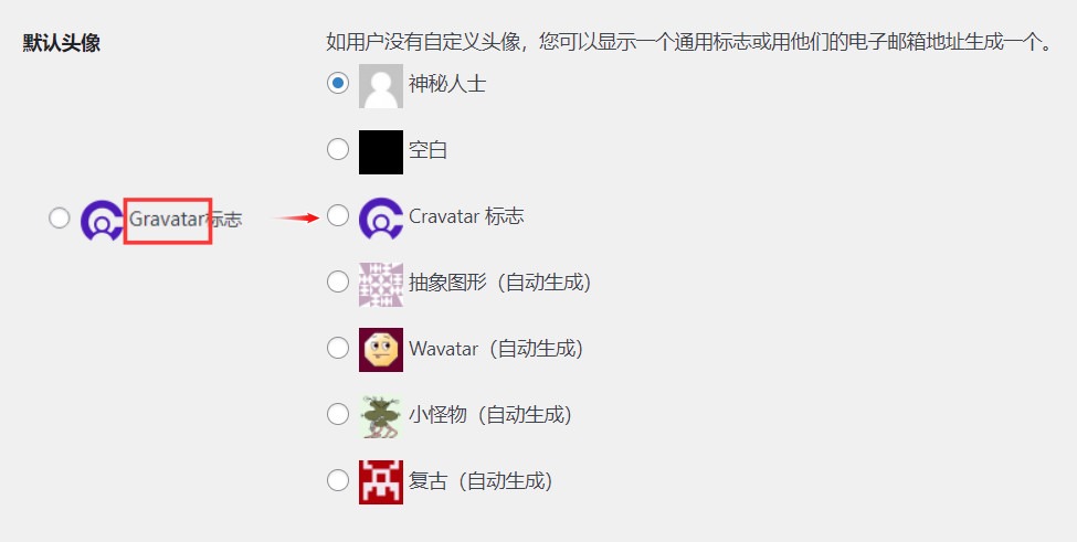 添加上面的代码以后,我们在 设置 – 讨论 界面的头像选择这里,仍然显示 Gravatar名称,使用下面的代码即可替换: